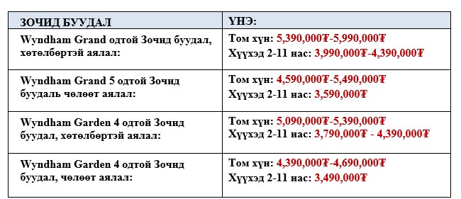 Аяллын үнэ нь явах өдөрөөс хамааран дээрх үнийн дагуу хэлбэлзэж байна.