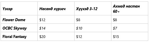 Нэмэлт мэдээлэл: Garden by the Bay цэцэрлэгт хүрээлэнгийн Flower Dome, OCBS Sky Way, Floral Fantasy зэргийн орох тасалбарын үнэ багтаагүй болно.