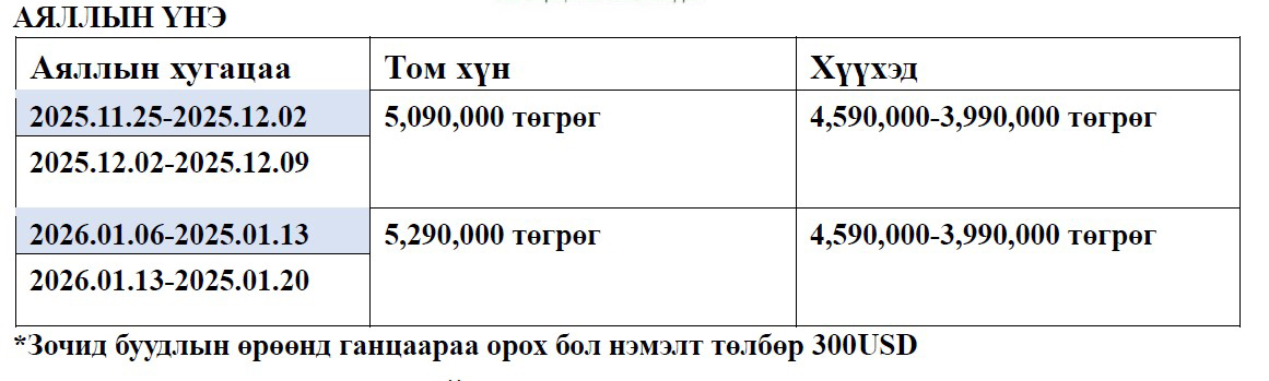 Аялал нь нутгийн болон Монгол гэсэн 2 хөтөчтэй байна.