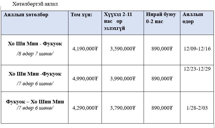 Улаанбаатар –Сайгон - Фукуок – Улаанбаатар нислэгийн тийз